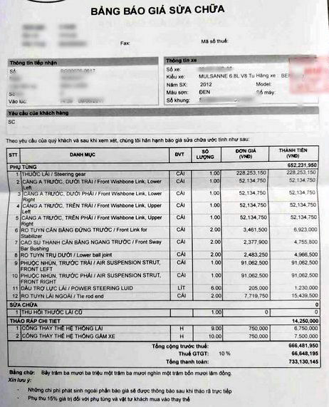 Mới đây, thông tin về chiếc xe siêu sang Bentley Mulsanne, sau 5 năm sử dụng tại Việt Nam, khi tiến hành bảo dưỡng, sửa chữa, thay thế phụ tùng với hóa đơn hết 733 triệu đồng, được đưa lên mạng khiến nhiều người không khỏi giật mình. Với số tiền quá lớn như vậy, có thể tậu được một chiếc ô tô phổ thông hạng C.