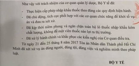 Với tất cả những giải trình trên, Bộ Y tế khẳng định, với trách nhiệm của cơ quan Dược, Bộ đã thực hiện cấp phép nhập khẩu thuốc theo đúng các quy định hiện hành; đã chủ động, tích cực phối hợp với các cơ quan chức năng để khởi tố vụ án và đưa ra xét xử; đã kịp thời niêm phong và ngăn chặn toàn bộ lô thuốc nhập khẩu kém chất lượng, không để một viên thuốc nào lọt ra thị trường; đã xử lý hành chính và khắc phục các kiến nghị của cơ quan điều tra.