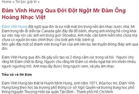 Trước đó, Đàm Vĩnh Hưng cũng từng bị đồn qua đời vì bạo bệnh khiến nam ca sĩ ngỡ ngàng, bức xúc. Cụ thể, trong bài viết đưa thông tin về giọng ca "Biển tình" đã "ra đi" có đoạn: "Đàm Vĩnh Hưng đột ngột qua đời là sự mất mát lớn trong nền âm nhạc nước nhà. Mr.Đàm trong lần đi diễn tại Canada gần đây đã đổ bệnh, nhưng anh không hề công khai sự việc này với các anh em trong giới showbiz. Anh mắc bệnh hiểm nghèo khó chữ mà chưa có nguồn tin nào chính thức cho biết anh mắc bệnh gì...".