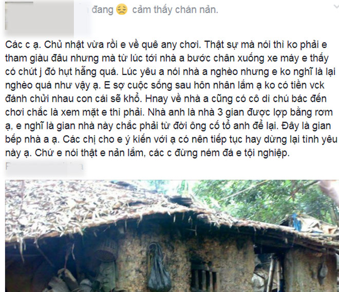 “Chủ nhật vừa rồi em về quê anh người yêu chơi. Thật sự mà nói thì không phải em tham giàu đâu nhưng mà từ lúc tới nhà anh, bước chân xuống xe máy, em thấy chút gì đó hụt hẫng quá. Lúc yêu, anh có nói nhà anh nghèo nhưng em không nghĩ lại nghèo quá như vậy… Nhà anh là nhà 3 gian được lợp bằng rơm, em nghĩ chắc phải từ đời ông cố tổ để lại”, cô gái sụt sùi.