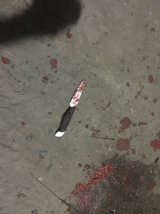 Lúc này, anh Phát phát hiện một thanh niên khoảng 20 tuổi, tóc vàng, mặc áo thun xanh, một tay cầm con dao, một tay cầm chiếc ca bên trong có chứa sơn màu đỏ.