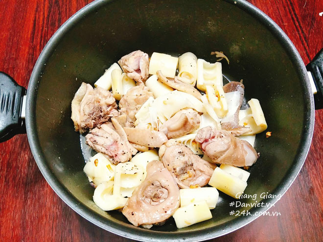 - Bước 4: Trút toàn bộ bát măng vừa xào sơ qua vào nồi thịt, thêm 1 chút nước và kho tới khi nước rút cạn, nếm lại cho vừa ăn rồi thêm hành lá thái khúc, đảo đều là tắt bếp, xúc ra đĩa thưởng thức với cơm nóng.