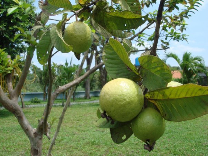 Cụm ổi được chị Tiên trồng ở nơi thoáng đãng, nhiều ánh sáng nên quả có màu sắc đẹp, ăn giòn và đậm.