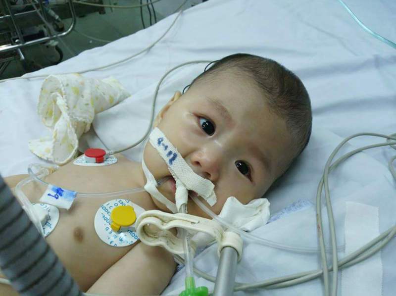 “Ngày 7 Tháng Chín, bé bị biến chứng viêm phổi suy hô hấp dẫn đến tím tái sắp lịm nên phải cấp cứu ở bệnh viện Nhi Đồng 1, Sài Gòn. Lúc đó sức khỏe bé ngày càng suy giảm, bác sĩ từng thông báo phổi bé rất xấu và bé có thể ngừng thở bất cứ lúc nào. Nhưng thương lắm, trông bé vẫn còn tỉnh táo lắm, ánh mắt bé như van xin cầu cứu. Hơn ba tuần nay bé phải phụ thuộc máy thở tại Khoa Cấp Cứu để được theo dõi đặc biệt,” chị kể.