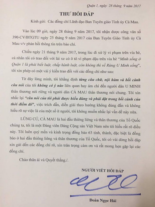 Phó chủ tịch Quận 1 vừa có thư hồi đáp gửi Ban tuyên giáo Tỉnh ủy Cà Mau liên quan đến phát ngôn: "Mình sống ở quận 1 là phải biết luật, chấp hành luật, còn không thì về rừng U Minh sống".