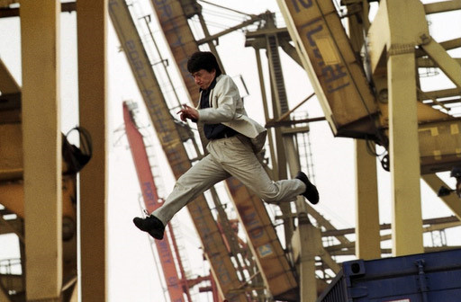 Pha phi người đầy mạo hiểm của Thành Long từ ṭa nhà này sang ṭa nhà khác mà không hề dùng thiết bị bảo vệ. Cảnh quay khiến khán giả vừa thích thú, vừa thót tim v́ mức độ nguy hiểm của nó.