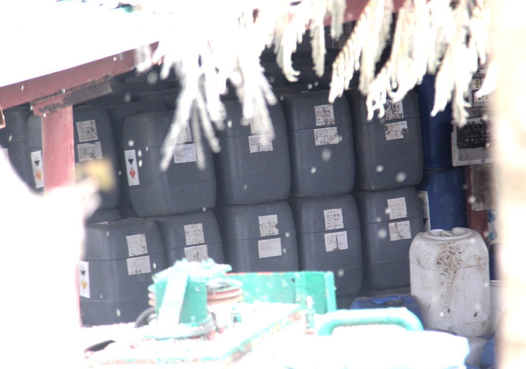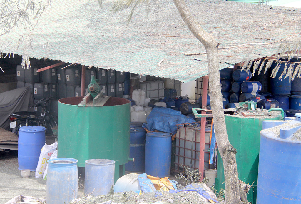 Hàng chục thùng nhựa với đủ kích cỡ nghi chứa hóa chất xếp ngổn ngang.