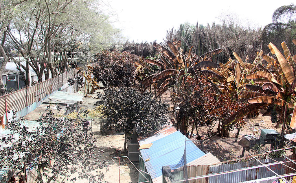 Cạnh hàng rào tôn là khu vườn của một người dân bị cháy đen do ảnh hưởng của khí NH3.