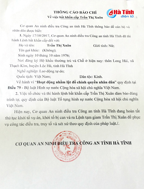 Ngày 17/10/2017, Cơ quan An ninh điều tra Công an Hà Tĩnh đã thi hành lệnh bắt đối tượng Trần Thị Xuân (SN 1976, trú tại thôn Long Hải, xã Thạch Kim, huyện Lộc Hà), về hành vi “Hoạt động nhằm lật đổ chính quyền nhân dân” quy định tại Điều 79, Bộ luật Hình sự nước Cộng hòa xã hội chủ nghĩa Việt Nam.