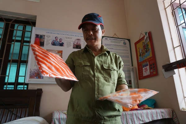 Chia sẻ về mức giá một chiếc khăn, bà Bích cho hay, khăn nhà làm ra bán 150.000 đồng/chiếc. Còn xuất sang nước ngoài, khách đặt thì 54 đô la (tương đương với 1,2 triệu đồng).