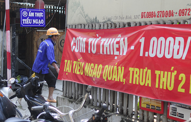 Trưa thứ Hai hàng tuần, nhiều người lao động có hoàn cảnh khó khăn, các bạn sinh viên nghèo đến con ngõ nhỏ trên đường Trần Bình (Cầu Giấy, Hà Nội) dùng bữa cơm chỉ với giá 1.000 đồng.