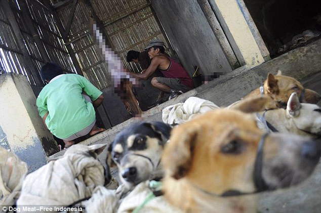 Biện pháp có phần đẫm máu này là cách thức được sử dụng ở khá nhiều lò mổ chó ở Indonesia. Những con chó chưa bị giết sẽ bị trói chặt tứ chi và nằm một xó, chờ ngày bị giết thịt.