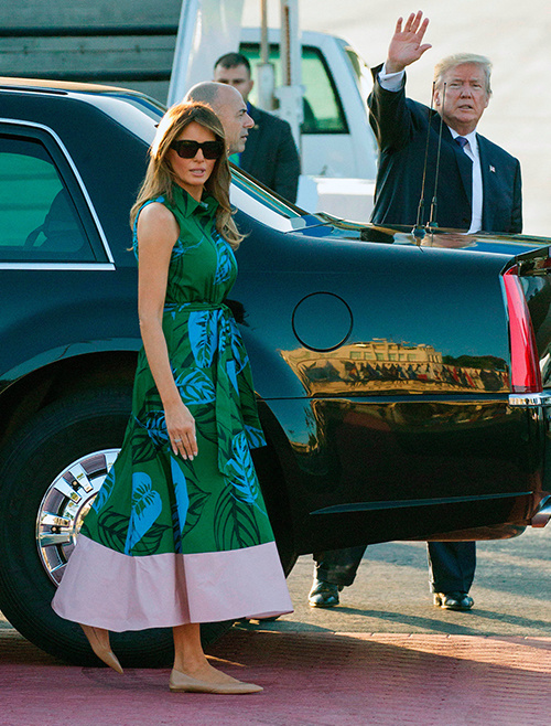 Bà Melania trẻ trung và thoải mái trong chiếc váy màu xanh mát mắt, in họa tiết lá cây của hãng Borgo De Nor, có giá hơn 1.000 USD. Bà đi giày bệt màu be từ thương hiệu Christian Louboutin, có giá hơn 520 USD. Ảnh: Independent.