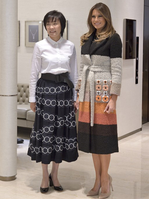Bà đã mặc trang phục này đến tham quan một cửa hàng trang sức ở Tokyo cùng Đệ nhất phu nhân Nhật Bản Akie Abe sau đó. Chiếc áo khoác với nhiều dải màu đính hoa đến từ thương hiệu Italy Fendi được bà Melania phối cùng đôi giày có giá gần 600 USD của nhà thiết kế Tây Ban Nha Manolo Blahnik. Ảnh: AFP.