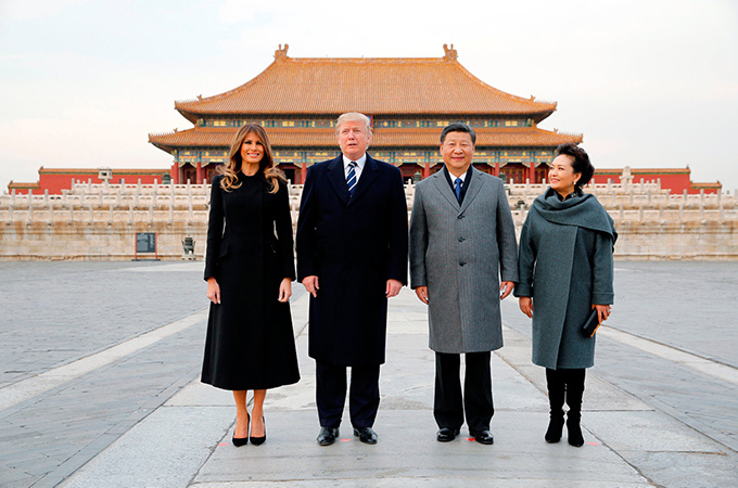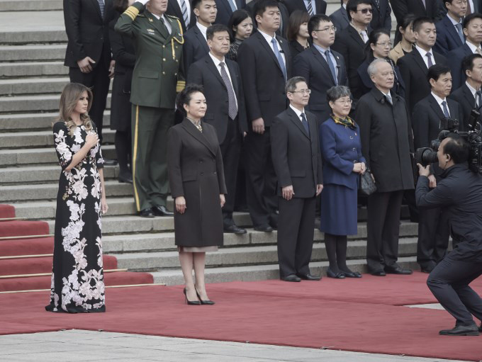 Vợ chồng Tổng thống Trump chụp ảnh cùng vợ chồng Chủ tịch Trung Quốc Tập Cận Bình trước Tử Cấm Thành, Bắc Kinh. Bà Melania diện chiếc áo khoác dạ dáng dài của Dior bên ngoài váy và đi giày cao gót cùng màu. Ảnh: Reuters.