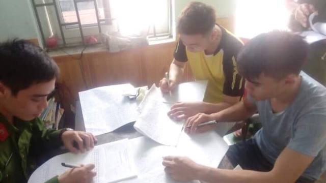 Các đối tượng viết tường trình tại cơ quan công an. Ảnh: Công Lợi