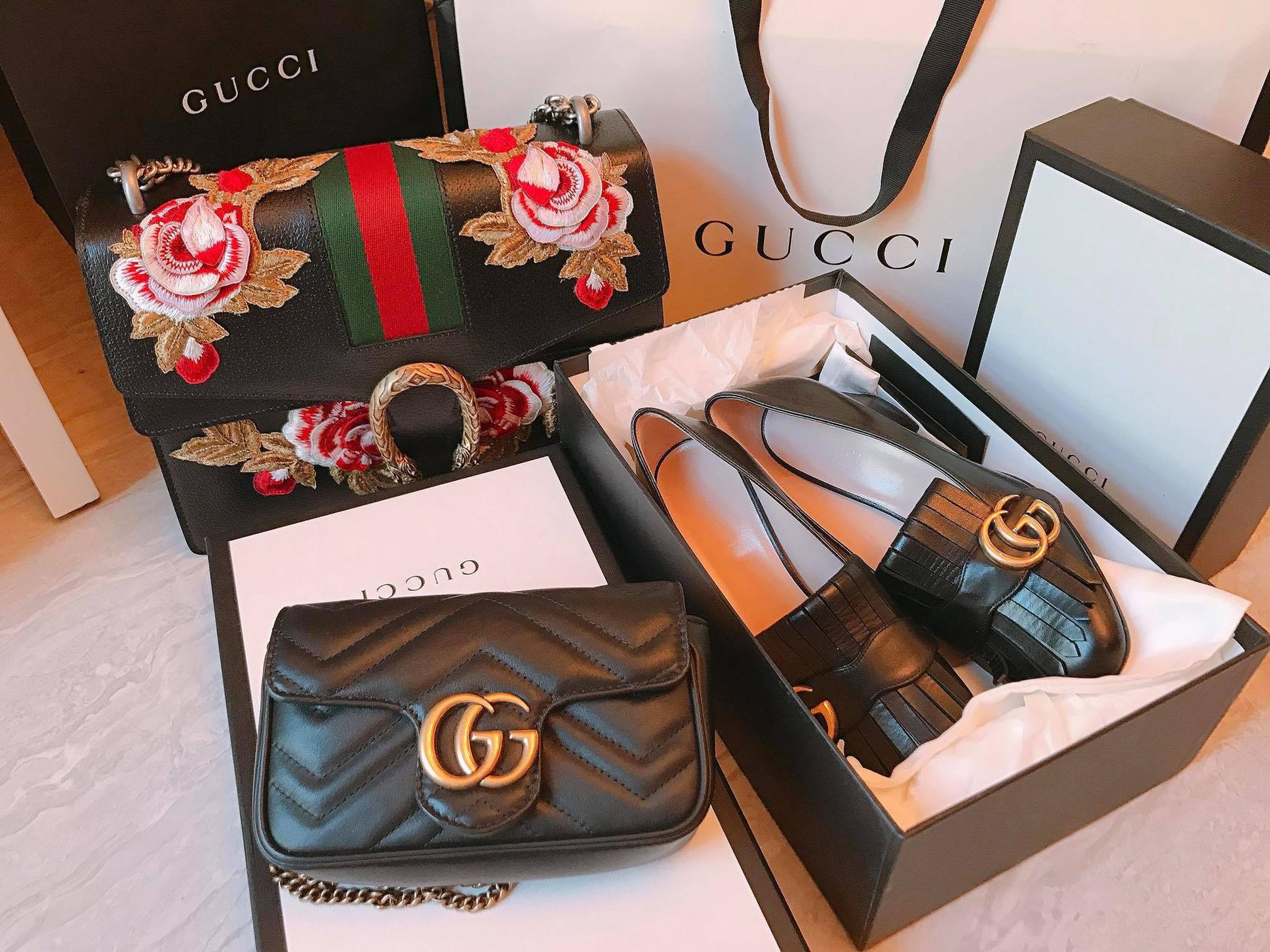 "Combo" đồ Gucci mà Midu mới tậu hồi tháng 10. Thành quả shopping của cô bao gồm một túi GG Marmont giá gần 40 triệu VNĐ kể trên, một túi Dionysus giá 96 triệu VNĐ và một đôi giày loafer cao gót giá 18 triệu VNĐ.