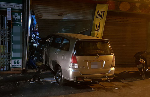 Khoảng 21h45 ngày 18/11, ôtô bảy chỗ liên tục đâm vào cửa hàng giặt là trên phố Mai Dịch (Cầu Giấy, Hà Nội). Mọi người xung quanh túa ra can ngăn, nhưng bất thành.