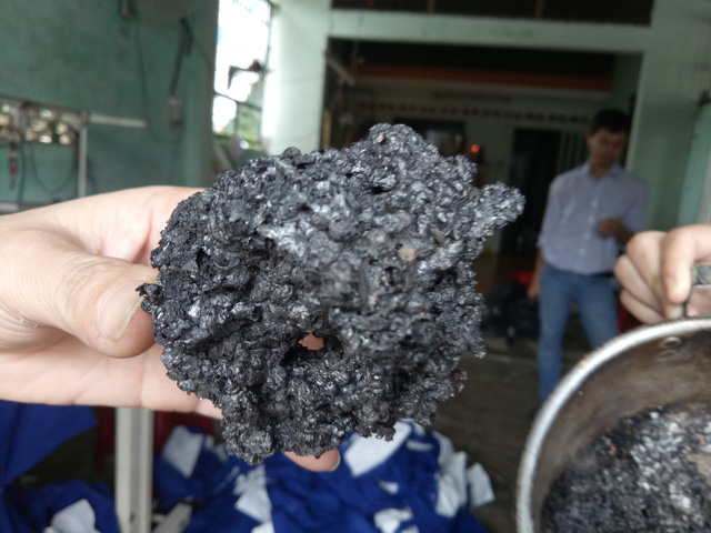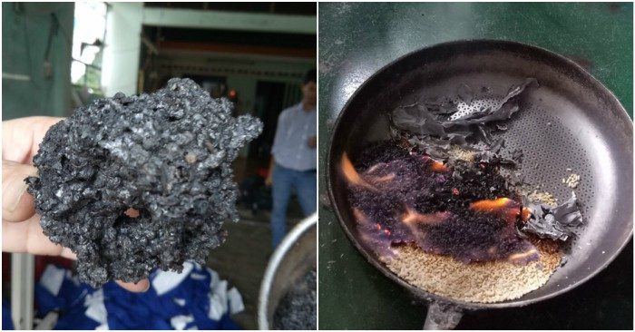 Sau khi rang và đốt thử, hạt gạo bắt lửa và bốc cháy. Sau khi cháy hết, phần tro kết dính thành mảng lớn như cao su khiến chị Liễu và thân nhân khá lo lắng.
