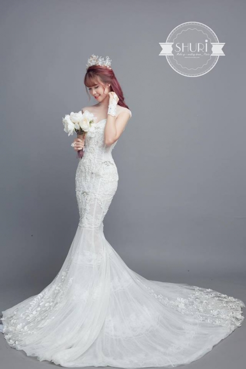 Khởi My xinh đẹp trong bộ váy cưới trắng kín đáo nhưng không kém phần quyến rũ.
