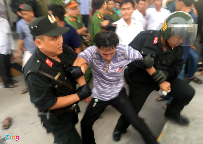 Cảnh sát áp giải một người dân ra khỏi BOT Cai Lậy. Ảnh: Minh Anh.