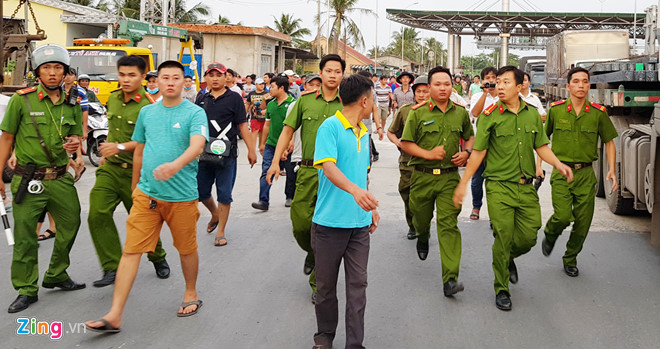 Khoảng 17h ngày 30/11, tài xế Nguyễn Minh Trung (31 tuổi, ngụ huyện Long Phú, Sóc Trăng) và Trịnh Hồng Phương (50 tuổi, ở thị xã Dĩ An, Bình Dương) bị cảnh sát cơ động áp giải lên ôtô, đưa về trụ sở Công an huyện Cai Lậy.
