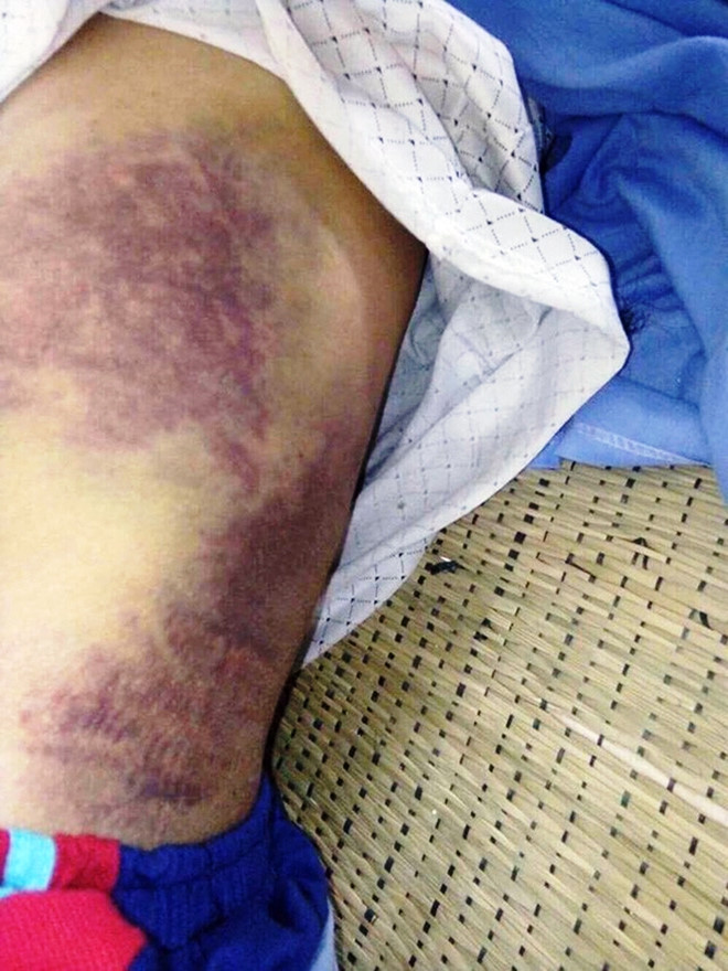 Ông Năng bị con trai đánh bầm tím chân tay, gãy xương sườn, mẻ xương bánh chè, xương ống chân. Ảnh: C.A.