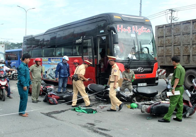 Khi đến giao lộ trước cổng KCN Vĩnh Lộc (phường Bình Hưng Hòa B, quận Bình Tân), ôtô khách bất ngờ tông hàng loạt phương tiện đang chờ dừng chờ đèn đỏ. Tai nạn khiến nhiều người điều khiển xe máy bị thương được người đi đường đưa đến bệnh viện cấp cứu. 7 xe máy cùng một xe tải bị hư hỏng, nằm la liệt giữa đường.