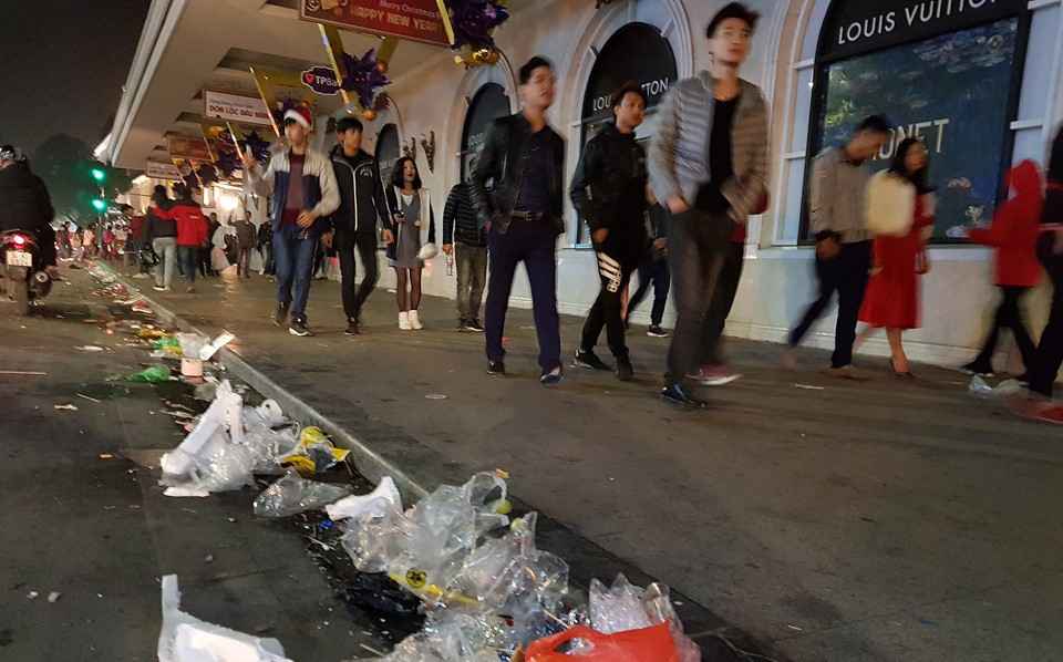 Sau đêm Noel, rác thải khắp các lối đi lại và trên nhiều tuyến phố.Dọc mặt tiền của trung tâm thương mại Tràng Tiền cũng trải đầy rác.