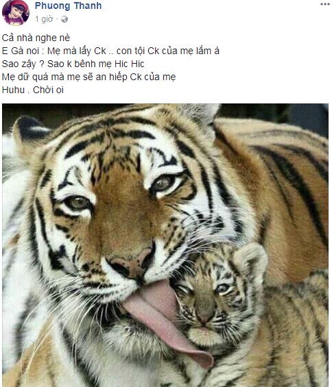 Cụ thể, bé Gà bày tỏ băn khoăn "Mẹ mà lấy chồng con tội chồng của mẹ lắm á". Khi Phương Thanh hỏi tại sao không bênh mẹ thì bé Gà nói: "Mẹ dữ quá mà mẹ sẽ ăn hiếp chồng của mẹ". Dòng chia sẻ này của Phương Thanh khiến nhiều người khá thích thú.