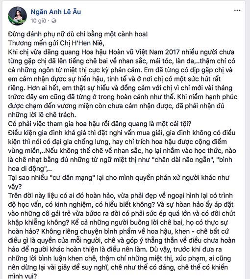 Trên trang cá nhân, Hoa hậu Đại dương Lê Âu Ngân Anh đặt tiêu đề cho bức thư dường như nhắn nhủ tới tất cả những ai đă ném đá Hoa hậu Hoàn vũ VN H’Hen rằng không nên vùi dập một cô gái dù có như thế nào.