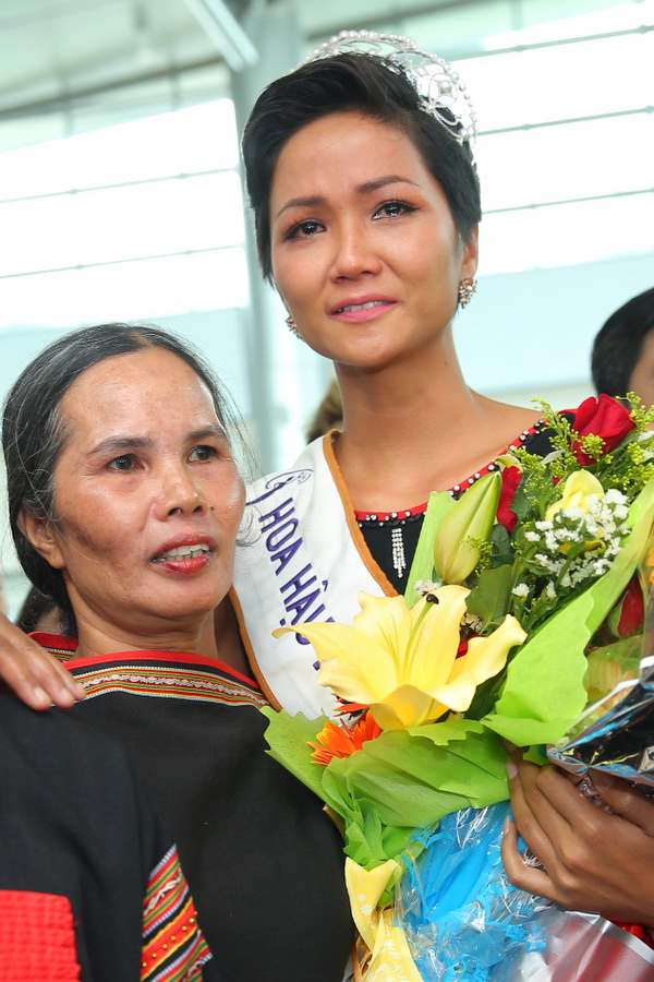 Hoa hậu Hoàn vũ Việt Nam 2017 H'Hen Niê trở về thăm quê nhà sau khi đăng quang. Trước tình cảm của người dân dành cho mình. H'Hen Niê òa khóc khi được người dân Ê đê chào đón ở sân bay.