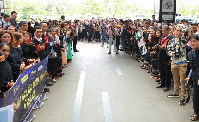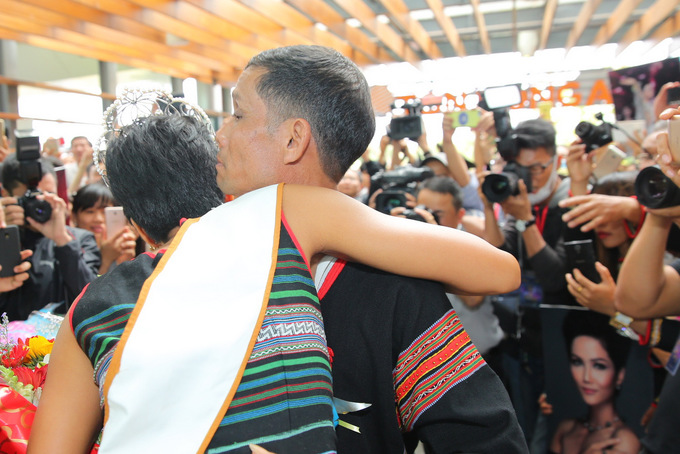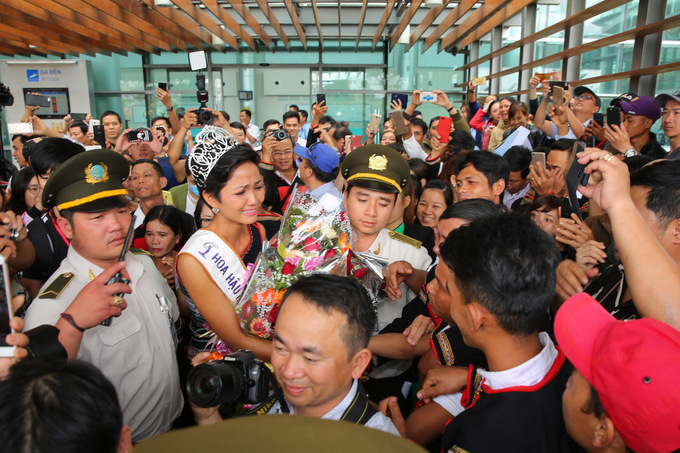 Đông đảo người dân Ê đê có mặt ở sân bay Buôn Ma Thuột để chào đón hoa hậu. Họ giăng băng rôn và liên tục gọi tên cô, chung niềm vui, sự tự hào khi cô gái buôn làng đoạt danh hiệu Hoa hậu Hoàn vũ Việt Nam 2017.