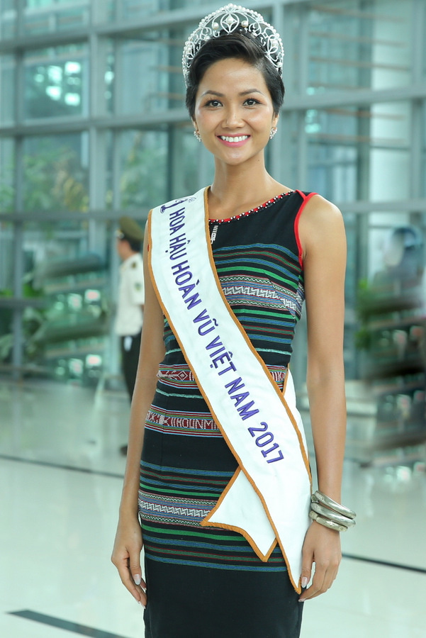 Trưa 22/1, H'Hen Niê đặt chân đến sân bay Buôn Ma Thuột. Chuyến đi là lần đầu cô trở về quê nhà sau khi đoạt vương miện Hoa hậu Hoàn vũ Việt Nam 2017 vào tối 6/1.