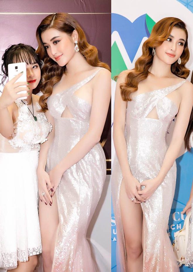 Trong một sự kiện mới nhất, Huyền My xuất hiện với vẻ ngoài vô cùng gợi cảm. Cô nàng diện một chiếc đầm xẻ cao đến tận eo. Do sợ lộ hàng, cô liên tục dùng tay che chắn.