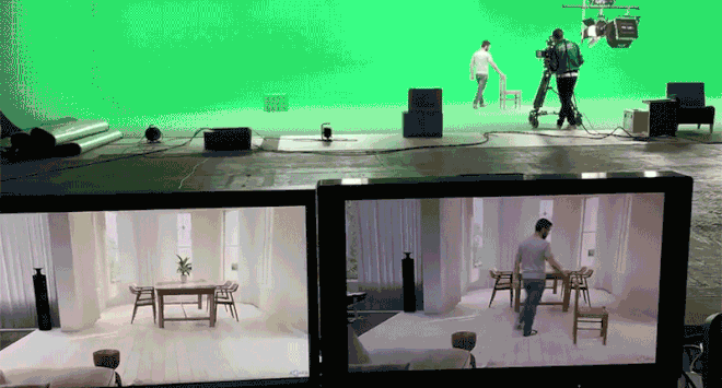 Hệ thống bạn thấy ở ảnh động bên trên sử dụng một màn hình xanh lớn, cùng với camera cảm biến chuyển động và sức mạnh của máy tính để giúp đạo diễn có thể xem diễn viên diễn xuất trong môi trường ảo như thế nào ngay lập tức mà không cần phải đợi chỉnh sửa. Tất nhiên giá của hệ thống trên là rất đắt đỏ, nhưng về lâu dài sẽ giúp tiết kiệm thời gian và kinh phí khi không phải sắp xếp cảnh quay và ghép nhiều lần.