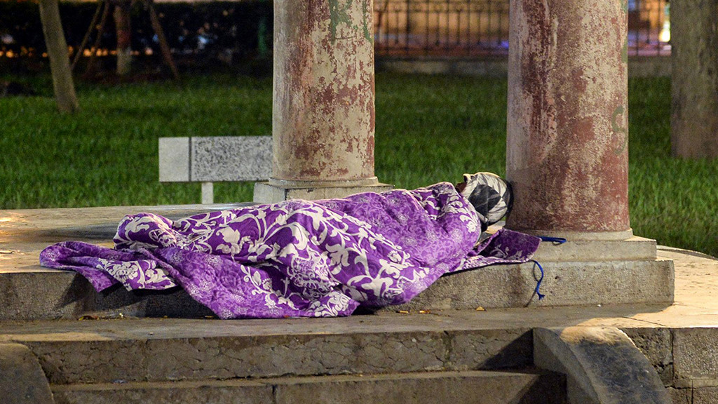 Một người vô gia cư ngủ trong công viên Lê nin trong thời tiết giá lạnh