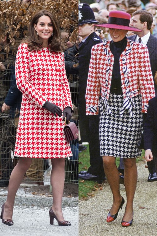 Chiếc áo khoác họa tiết houndstood Kate Middleton mặc mới đây cũng là kiểu mẹ chồng cô rất yêu thích từ cách đây gần 30 năm.