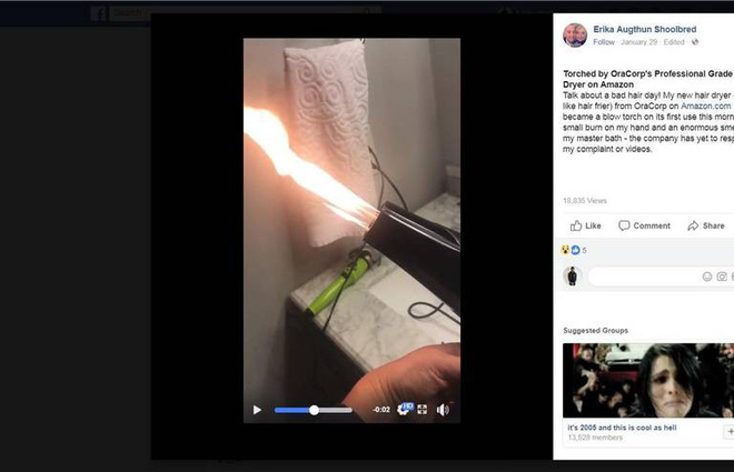 "Quả là ngày tóc tai tồi tệ!" Cô viết trên Facebook. "Chiếc máy sấy tóc của OraCorp trên Amazon.com đã trở thành súng phun lửa trong lần sử dụng đầu tiên vào sáng nay".