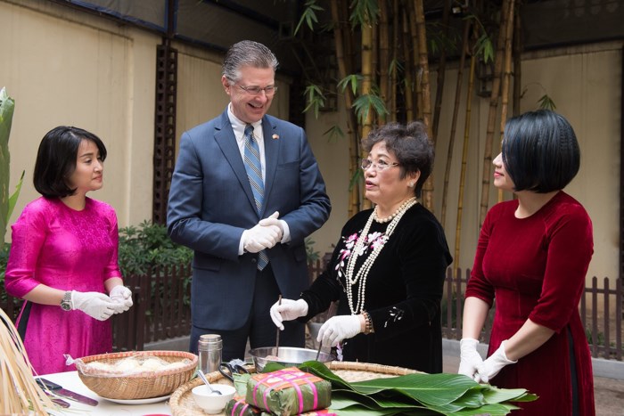 Đại sứ Mỹ tại Việt Nam, ông Daniel J. Kritenbrink, trong cái Tết đầu tiên ở Việt Nam, đã tự tay mình gói bánh chưng tại nhà riêng.