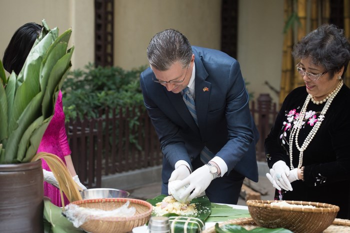 Đây là lần đầu tiên Đại sứ Hoa Kỳ gói bánh chưng và ông tỏ ra khá hào hứng với công việc này.