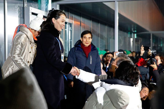 Bà Kim Yo Jong, với tư cách đặc phái viên của lãnh đạo Kim Jong Un, bắt tay tổng thống Hàn Quốc Moon Jae In tại lễ khai mạc Olympics PyeongChang ngày 9/2/2018 (Ảnh: PATRICK SEMANSKY/AP)