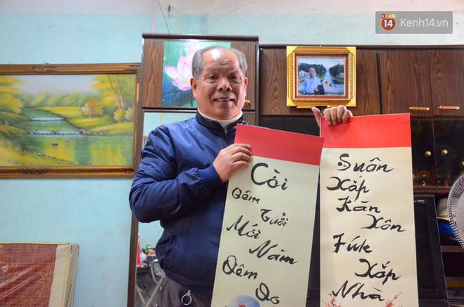 Ông Hiền thích thú chia sẻ hai câu đối được ông viết bằng bảng chữ cái cải tiến.