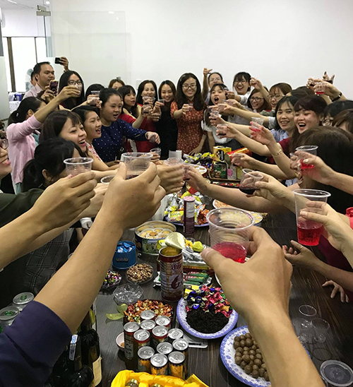 Không chỉ sếp mà các nhân viên cũng hồ hởi lì xì, chúc nhau năm mới tốt lành.