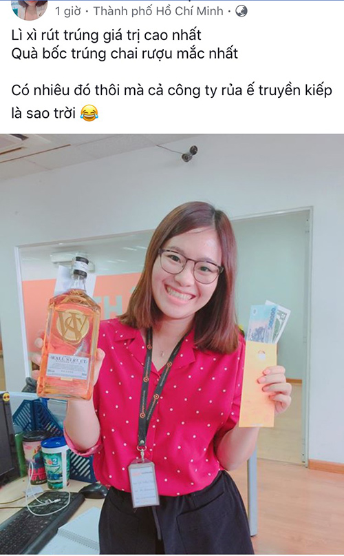 Nhiều nhân viên hứng khởi khi được sếp đi khắp các phòng ban lì xì cho nhân viên. "Năm nào công ty mình cũng có truyền thống lì xì, chúc Tết đầu năm. Năm nào mình cũng tranh thủ ăn Tết ở quê xong vào thật sớm, đi làm đúng giờ để được nhận lì xì lấy hên", Quang Minh chia sẻ.