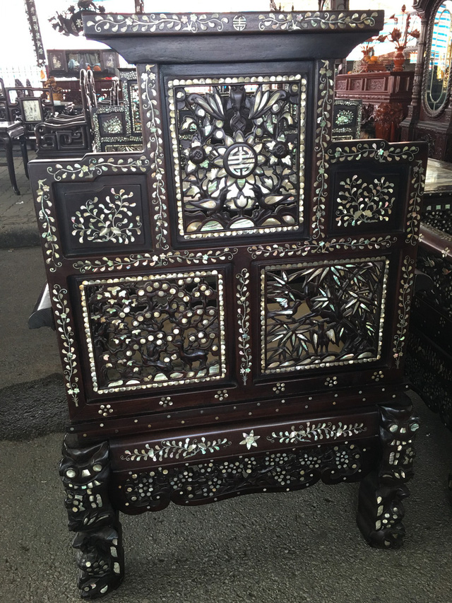 “Nhưng chơi cái này nên chơi cả bộ, nếu không thì nên chơi kiểu “trường kỷ ngũ sơn khảm ốc”. Vì bộ đó có 1 ghế dài hoặc 2 ghế dài, chơi thế đúng kiểu hơn. Vì thế, tôi thường khuyên khách mua cả bộ bàn ghế và long sàng luôn”, người chủ cho biết thêm.