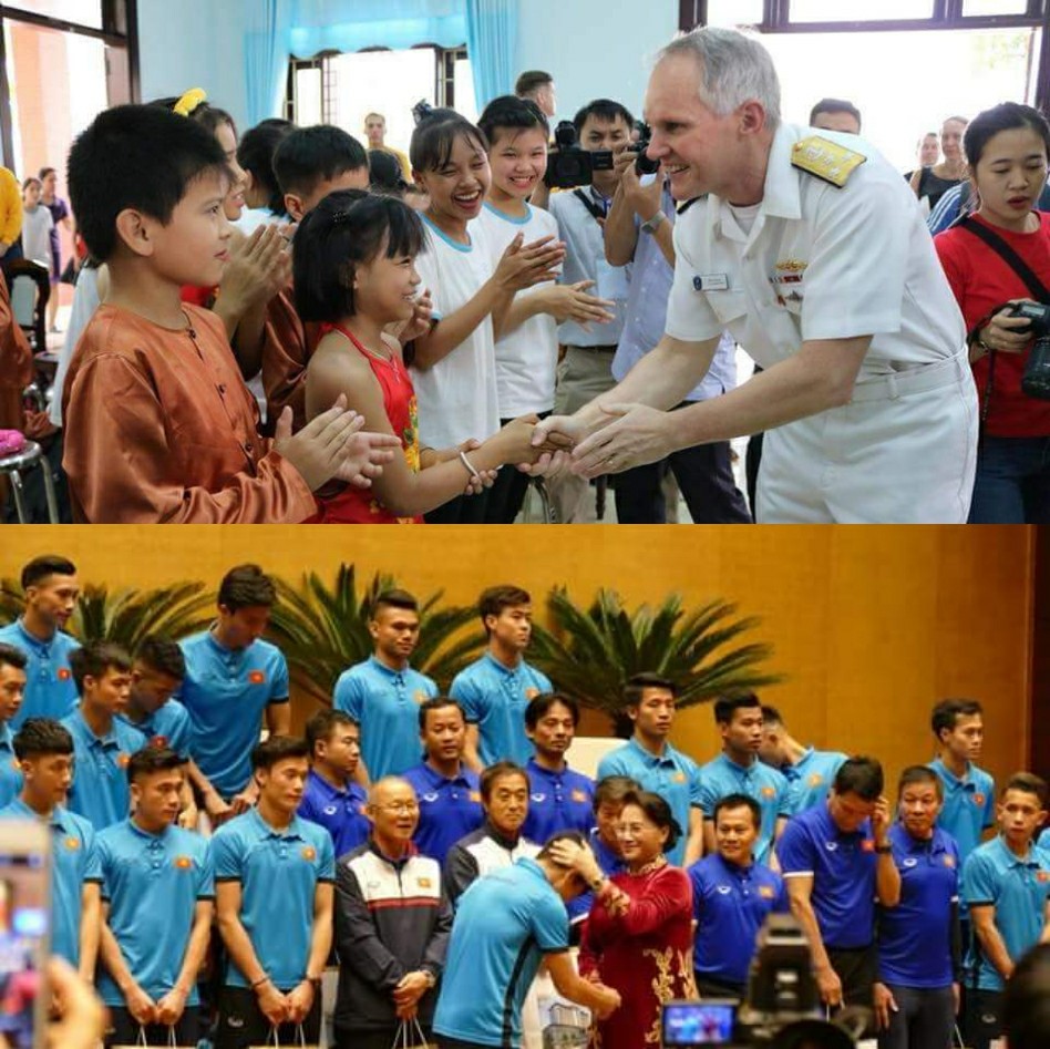 Ảnh bà chủ tịch quốc hội bắt tay mừng đội U23 và tướng hải quân Mỹ bắt tay trẻ em tạ Đà Nẵng.