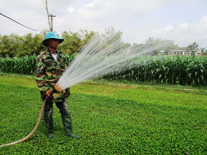 Ông Phi thường xuyên tưới nước cho rau má. (Dân Việt)