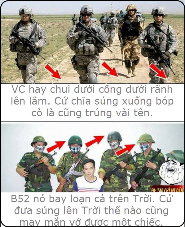 Hai hình ảnh, một của quân đội Mỹ, hai của VC, TC, HC...Nếu để ý kỹ bạn sẽ thấy cách mang súng của họ khác nhau.