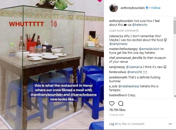Anthony Bourdain đã vô cùng ngạc nhiên và không thể hiểu nổi với diện mạo mới của quán bún chả Hà Nội. Quán ăn này từng được ông và cựu tổng thống Obama ghé qua. Hình ảnh về quán đã được Anthony Bourdain đăng tải trên trang cá nhân với dòng bình luận khó hiểu.
